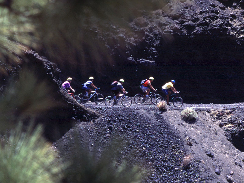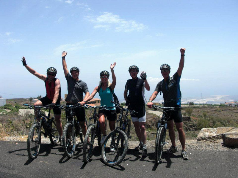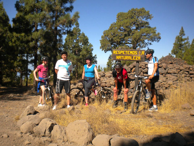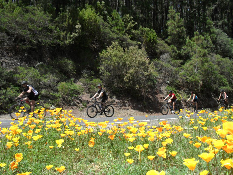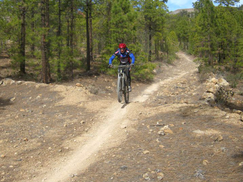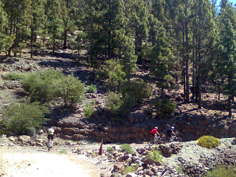 We klimmen naar een hoogte van ongeveer 15 kilometer per mountain bike, via boswegen en rotsachtige paden (deze al in goede staat), door de boskroon van het typische Canarische bos is.